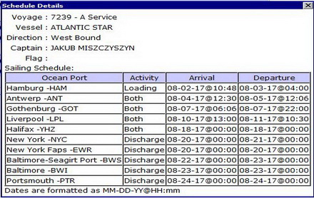 Da die Reederei auch dieses Mal Probleme mit dem Fahrplan hat, steuert das Schiff zunächst Antwerpen an, um danach über Götheburg, Liverpool nach Halifax zu fahren..